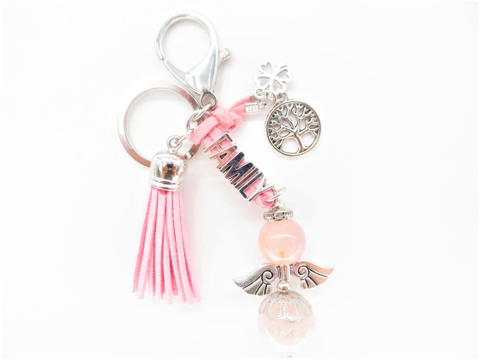 Sleutelhanger met rozenkwarts, en engel, tekst "family" en klavertje vier en levensboom bedeltjes (totale lengte = 13cm).